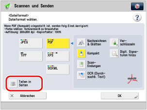 Wenn Sie [PDF], [XPS], [TIFF] oder [OOXML] als Dateiformat wählen, können Sie die Funktion Teilen in Seiten verwenden.