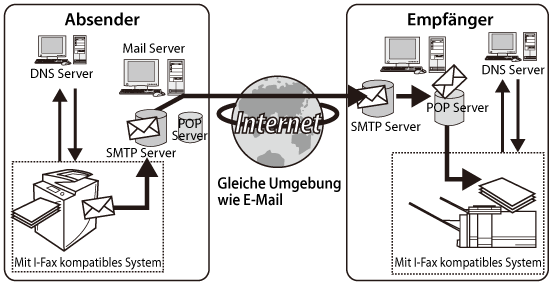 Die Normen für I-Fax sind durch ITU-T (International Telecommunication Union - Telecommunication Standardization Sector = Internationale Fernmeldeunion - Sektor für Telekommunikationsnormung) definiert. Senden und Empfangen mit Systemen anderer Hersteller ist möglich, solange die Geräte mit ITU-T konform sind. Das imageRUNNER ADVANCE ist konform mit der Empfehlung T.37 (Verfahren für die Übertragung von Faxdaten durch Speicherung und Weiterleitung im Internet).