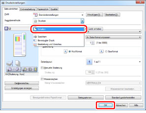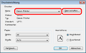 Wählen Sie im Menü [Datei] der Anwendungssoftware, die Sie zum Drucken der Datei (Auftrag) verwenden, die Option [Druck] → Wählen Sie den Drucker zur Verwendung und klicken Sie auf [Eigenschaften] im Dialogfeld [Druck].