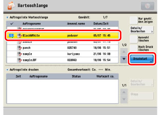 Wählen Sie Aufträge aus der Auftragsliste Warteschlange in der Reihenfolge, in der Sie drucken möchten → Berühren Sie die Taste [Druckstart].