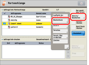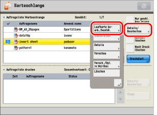 Wählen Sie den Job aus der Auftragsliste Warte → Berühren Sie [Musterdruck] → [Details/Bearbeiten].