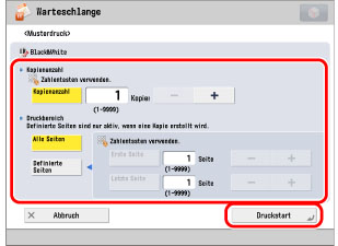 Geben Sie die Anzahl der Drucke und den Druckbereich an → Berühren Sie die Taste [Druckstart].