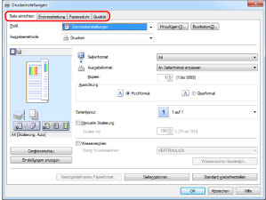 Klicken Sie auf die Register [Seiteneinrichtung], [Endverarbeitung], [Papierzufuhr] und [Qualität], um die erforderlichen Einstellungen zu definieren.