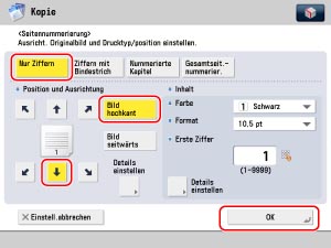 Berühren Sie die Taste [Optionen] → [Seitennummerier.].