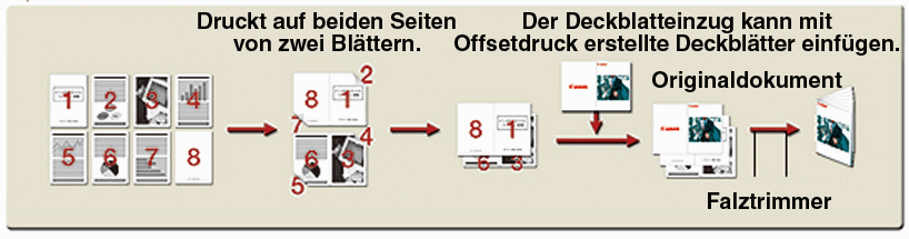 Sie können die Seiten automatisch anordnen lassen, und zwar zwei Originalseiten pro Ausgabeblatt in festgelegtem Format und festgelegter Ausrichtung, gemäß der Seitenfolge nach der Sattelheftung. Sie können auch ein Deckblatt einfügen.