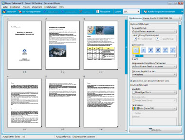 Überprüfen Sie die Papierausgabeeinstellungen in Document Binder und das in den Drucker eingelegte Papier. Wenn sich das mit Document Binder eingestellte Papierausgabeformat vom Format des im Drucker eingelegten Papiers unterscheidet, werden die Dokumente nicht korrekt ausgedruckt.