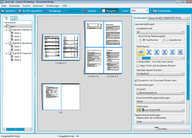 Sie können die Dokumentenverwaltungssoftware iW Desktop für die Zusammensetzung von verschiedenen Dokumenten, die mit verschiedenen Anwendungen erstellt wurden, und die Druckeinstellungen von imageRUNNER ADVANCE verwenden, um einen Druckvorgang mit Sattelheftung durchzuführen.