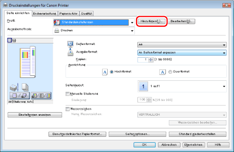 Legen Sie die gewünschten Einstellungen im Druckertreiber-Bildschirm fest → Klicken Sie auf [Hinzufügen].