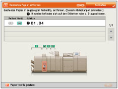 Wenn ein Papierstau auftritt und der Druck stoppt, wenn Sie mit der Funktion <Heften> drucken, entfernen Sie das Papier nicht von anderen Bereichen als denen, für die im Sensordisplay angezeigt wird, dass dort ein Papierstau vorliegt. Wenn zum Beispiel Papier in der Haupteinheit gestaut ist, entfernen Sie nicht die ausgegebenen Blätter in dem Finisher, der keinen Papierstau aufweist. (Der Druck- und Heftvorgang wird fortgesetzt, nachdem Sie das Papier in der der Haupteinheit entfernt haben.)