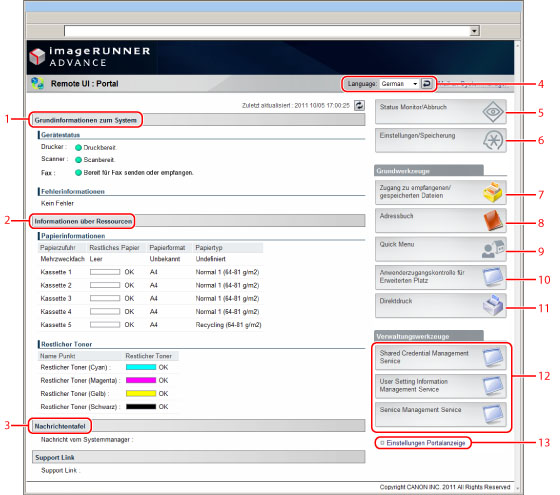 Wenn Sie die Anzeigesprache über die Portalseite des Remote UI ändern, wird die Sprache eventuell nicht korrekt angezeigt, wenn die ausgewählte Sprache von der Anzeigesprache des Sensordisplays am System abweicht.