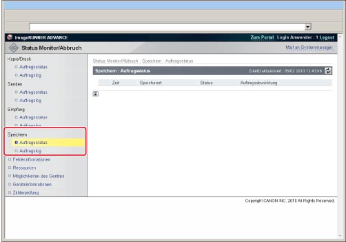 Klicken Sie auf [Auftragsstatus] → Klicken Sie für den Auftrag, den Sie löschen wollen, auf [Löschen].