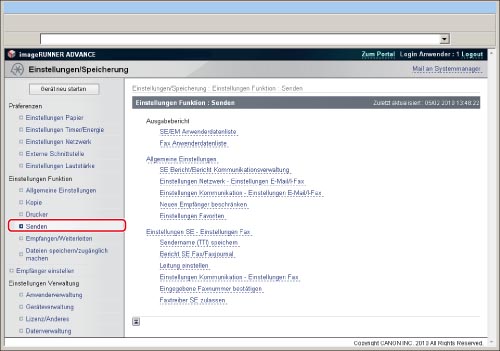 Klicken Sie auf [Einstellungen/Speicherung] → Wählen Sie [Senden] für <Einstellungen Funktion>.