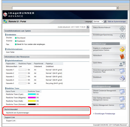 Wenn Sie [Anzeige auf dem Portal] wählen, wird das Message Board auf der Portalseite des Remote UI angezeigt.