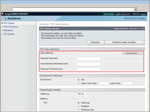 Wenn Sie versuchen, eine Datei ohne Eingabe des Passworts zu drucken, wird die Meldung <PDL PDF Datendecod.fehl.> angezeigt und der Druckvorgang wird abgebrochen. Zum Drucken von PDF-Dateien, die nicht zum Druck zugelassen sind, oder von PDF-Dateien, die nur den Druck mit einer niedrigen Auflösung in hoher Auflösung zulassen, geben Sie das Masterpasswort ein.