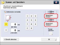 Berühren Sie die Taste [X] oder [Y] → Geben Sie das Scanformat in mm ein.