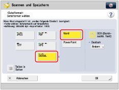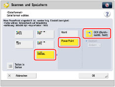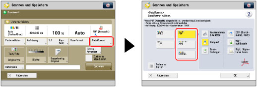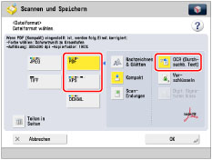 Wenn Sie PDF oder XPS als Dateiformat wählen, können Sie gleichzeitig auch [Kompakt] und [OCR (Durchsuchb. Text)] wählen. In diesem Fall wird [PDF (Kompakt)] oder [XPS (Kompakt)] auf dem Grundfunktionendisplay zum Scannen und Senden angezeigt.