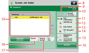 Berühren Sie diese Taste, um weitere Funktionen zum Scannen und Senden auszuwählen und zu verwenden. Auf diese Weise können Sie praktische Sendefunktionen wie den gemeinsamen Versand von Originalen mit unterschiedlichem Format oder den Versand von doppelseitigen Originalen nutzen.