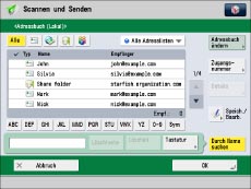 Berühren Sie die alphanumerischen Tasten (z. B. [ABC]), um die zugeordneten einzelnen Zeichen oder Ziffern anzuzeigen. Sie können die angezeigten Einträge eingrenzen, indem Sie einen Buchstaben oder eine Ziffer auswählen. Durch Berühren von [Alle] kehren Sie zur gesamten Adressenliste zurück.
