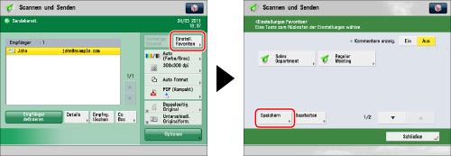 Berühren Sie die Taste [Scannen und Senden] → Geben Sie den Empfänger und die Sendeeinstellungen an, die Sie speichern möchten.
