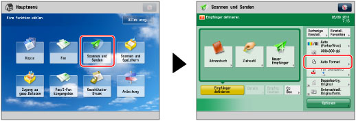 Berühren Sie die Taste [Scannen und Senden] → Berühren Sie die Scanformat-Taste.
