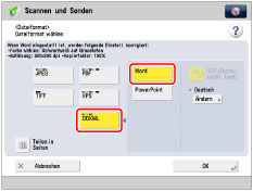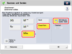 Wenn Sie PDF oder XPS als Dateiformat wählen, können Sie gleichzeitig auch [Kompakt] und [OCR (Durchsuchb. Text)] wählen. In diesem Fall wird [PDF (Kompakt)] oder [XPS (Kompakt)] auf dem Grundfunktionendisplay zum Scannen und Senden angezeigt.