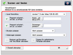 Sie können die Einstellungen für verschlüsselte PDF-Dateien in Ihren Favoriteneinstellungen speichern. Wenn Sie die Passwörter [Passw., um Dok.zu öffn.] und [Zulassungspasswort] nicht unter [Einstell. Favoriten] speichern möchten, lassen Sie sie frei.