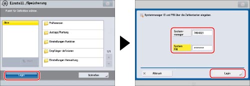 Wenn Sie die Verwaltung per Abteilungs ID als Login Service für das System verwenden, sind die Vorgänge, die ein allgemeiner Anwender ausführen kann, eingeschränkt. Damit alle Vorgänge auf dem Display <Einstellungen/Speicherung> verfügbar werden, geben Sie die Systemmanager-ID und die System PIN ein und melden Sie sich so als Administrator an.