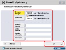 Berühren Sie die Taste [Kontaktinformationen] → Geben Sie die Kontaktinformationen für den Systemmanager ein → Bestätigen Sie durch Berühren der Taste [OK].