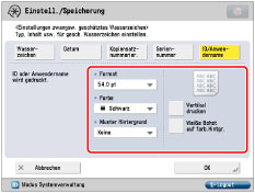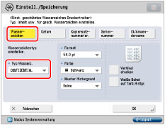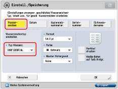 Berühren Sie die Taste [Wasserzeichen] → Berühren Sie die Auswahlliste <Typ Wasserz.> → Wählen Sie den Typ des Wasserzeichens.
