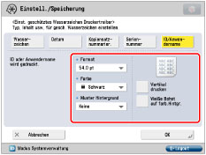 Wenn Sie die Funktion <Geschütztes Wasserzeichen> für jeden Auftrag vom Druckertreiber verwenden möchten, klicken Sie im Dialogfeld [Druckeinstellungen] auf die Registerkarte [Endverarbeitung] → [Erweiterte Einstellungen] → Setzen Sie [Funktion mit geschütztem Druck des Geräts] auf [Ein]. Nähere Informationen finden Sie in der Online-Hilfe für den Druckertreiber.