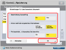 Die Funktion <Scanschutz Dokument> wird nicht verwendet, Wenn ein Dokument mit eingebettetem TL-Code gescannt wird, wird der Scanauftrag selbst dann gestartet, wenn die Information [Alles verbieten] eingebettet ist.