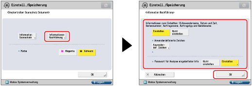 [Einstellen] wird für <Passwort für Analyse eingebetteter Info> in <Informationen Nachführung> standardmäßig festgelegt. Das Standardpasswort ist '7654321'. Es wird empfohlen, dass Passwort zu ändern. Wenn <Passwort für Analyse eingebetteter Info> auf [Einstellen] festgelegt ist, wird die Passwortauthentisierung angefordert, wenn die Nachführungsinformationen mit dem Document Scan Code Analyzer for MEAP analysiert werden. Zur Verstärkung der Vertraulichkeit wird empfohlen, die Passwortauthentisierung für die Analyse der Nachführungsinformationen festzulegen.