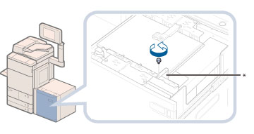 Befestigen Sie die schwarze Justierschraube auf der linken Seite mithilfe einer Münze, eines Schraubendrehers o.ä. und drücken Sie dabei die äußere Papierformatplatte leicht gegen den Papierstapel.