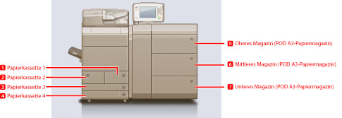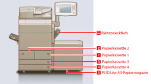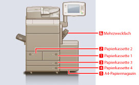 Wenn es eine Papierzufuhr mit demselben Papierformat, demselben Papiertyp und derselben Papierfarbe gibt, wählt das System automatisch diese Papierzufuhr und setzt den Druckvorgang fort.