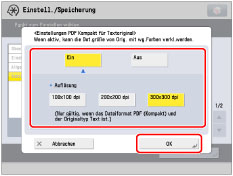 Diese Einstellung ist nur gültig, wenn das Dateiformat [PDF (Kompakt)] ist und wenn [Text] für [Originaltyp] in [Optionen] in "Scannen und Senden" oder "Scannen und Speichern" gewählt ist.