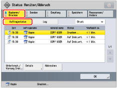 Der ausgewählte Auftrag wird abgebrochen. [Abbrechen] wird angezeigt, wenn ein Auftrag ausgewählt ist. Berühren Sie nacheinander die Tasten [Abbrechen] → [Ja], um den Auftrag abzubrechen.