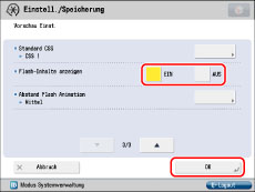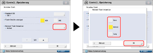 Wenn [Intervall Flash Animation] auf 'Kurz' gesetzt wird, können andere Vorgänge, wie Drucken, sich verlangsamen.