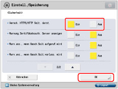 Berühren Sie [Sicherheit] → Wählen Sie [Ein] für <Versch. HTTPS/HTTP Seit. darst.> aus → Berühren Sie [OK].