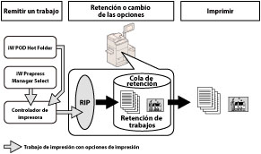 Un trabajo presentado se guarda en la Cola de retención. Los trabajos de la Cola de retención ya han completado el proceso RIP (Procesador de imágenes de trama). Puede imprimir cualquier trabajo guardado en la Cola de retención.