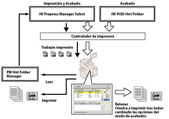 PM Hot Folder Manager es una aplicación estándar que viene con Prepress Manager. PM Hot Folder Manager le permite leer remotamente documentos desde un ordenador y guardar los datos leídos en una carpeta de soporte*1 del ordenador. Esta aplicación es la más adecuada para encaminar trabajos de impresión a petición.