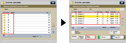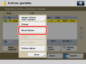 No puede mover ni duplicar un archivo que haya sido compilado con [Fusionar varios archivos] o [Insertar páginas] en [Editar archivo] de la pantalla Selección de archivo, a la Cola de retención.