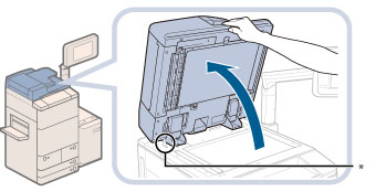Este equipo dispone de un sensor de apertura/cierre del alimentador (consulte la zona rodeada con un círculo en la ilustración anterior). Para poner originales en el cristal de copia, levante el alimentador unos 300 mm con el fin de que el sensor se separe del alimentador. Si el sensor no se separa de la cubierta del alimentador, es posible que no se detecte correctamente el tamaño de los originales.