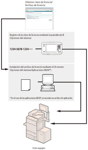 http://canon.com/fau/downloads Cuando descargue los manuales y el software asociado de las opciones de sistema/aplicaciones MEAP, prepare el certificado del número de acceso de la licencia que forma parte del paquete.