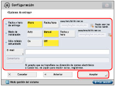 Si se especifican las opciones de entrega, se eliminan el firmware descargado, el firmware programado para actualizar y las reservas de entrega. Asegúrese de que no los necesita antes de especificar las opciones.