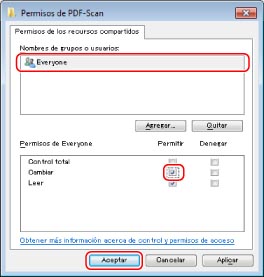Seleccione [Everyone] → compruebe que está seleccionada la opción [Permitir] en [Cambiar] → haga clic en [Aceptar]. Si no está seleccionada [Permitir], seleccione [Permitir] → haga clic en [Aceptar].