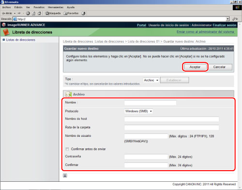 Si aparece <Compruebe el destino de inicio de sesión, nombre de usuario, y contraseña> no podrá establecer el inicio de sesión/destino desde el equipo.