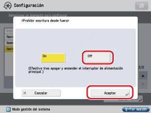 Siga los procedimientos indicados a continuación para comprobar si la opción [Prohibir escritura desde fuera] está establecida en 'Off'.