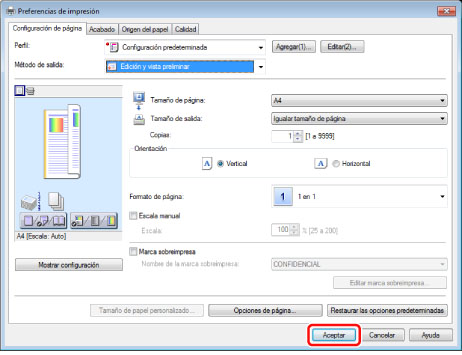 En cada hoja de la pantalla del controlador de impresora, especifique las opciones de impresión → haga clic en [Aceptar].