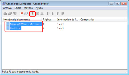 De la lista [Nombre del documento] del cuadro de diálogo [Canon PageComposer], seleccione los documentos que desea fusionar en uno solo → haga clic en [