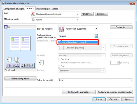 En la hoja [Acabado], seleccione [Impresión en cuadernillo] en [Estilo de impresión].
